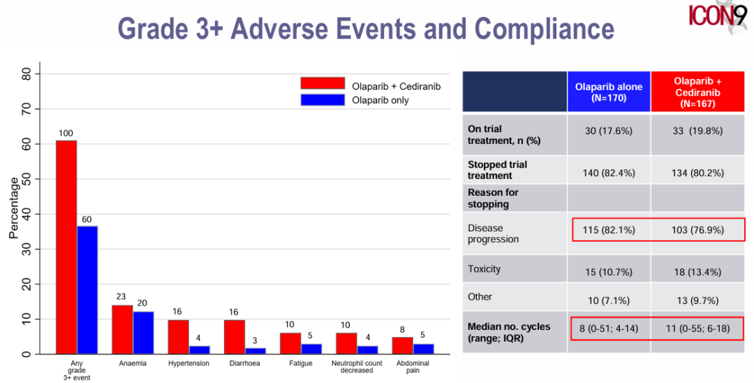 两个方案的安全性特征与奥拉帕利、Cediranib的预期毒性大致一致。奥拉帕利组和奥拉帕利+Cediranib组分别有17.6%(n=30/170)和19.8%(n=33/167)的患者正在进行试验治疗,分别有82.1%(n=115)和76.9%(n=103)的患者出现疾病进展,分别有10.7%(n=15)和13.4%(n=18)的患者出现毒性反应。中位治疗周期数分别为8(范围,0-51)和11(范围,0-55)周期。