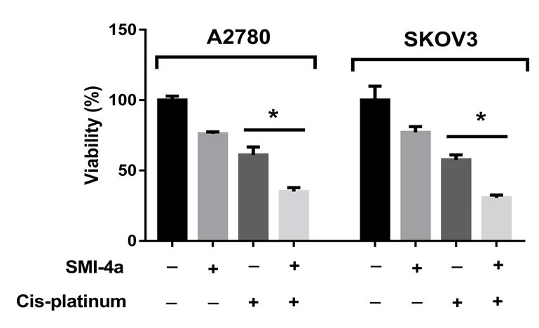 图示Pim1抑制剂(SMI4a)可诱导卵巢癌细胞对顺铂化学增敏。对A2780和SKOV3细胞系分别进行SMI4a,顺铂、SMI4a联合顺铂给药,48h后进行细胞活力检测。* P < 0.05