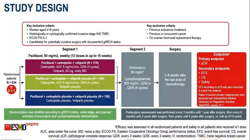 [6] Loibl?S et al. Event-free survival (EFS), overall survival (OS), and safety of adding veliparib (V) plus carboplatin (Cb) or carboplatin alone to neoadjuvant chemotherapy in triple-negative breast cancer (TNBC) after ≥4 years of follow-up: BrighTNess, a randomized Phase 3 trial. ESMO Congress 2021, Abstract 119O
