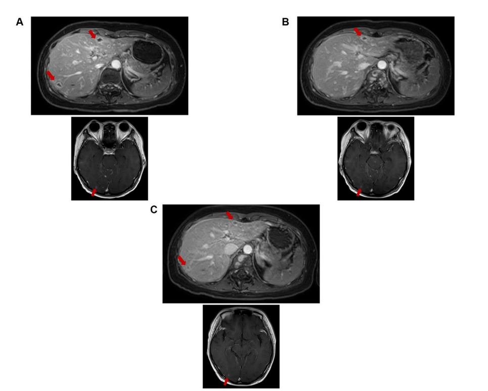 图1. 脑和肝脏的MRI图像。(A)2020年5月6日MRI(DS-8201治疗前)。(B)2020年6月17日MRI(2个疗程后)。(C)2020年8月3日MRI(4个疗程后)。