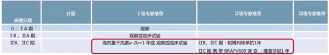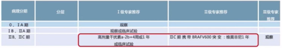 IIB、IIC期患者可I级推荐高剂量干扰素a-2b×4周或1年或临床试验;IIC期携带BRAF V600突变的患者可II级推荐维莫非尼1年;III期患者可I级推荐高剂量干扰素a-2b×4周或1年;