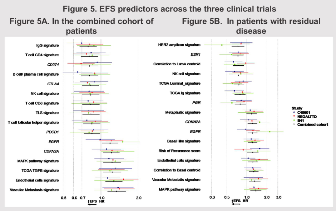 该研究通过联合分析CALGB 40601,NeoALTTO和NSABP B-41试验这三项关于新辅助治疗的Ⅲ期临床试验来评估乳腺癌不同内在亚型、基因表达特征与病理完全缓解(pCR)、无事件生存(EFS)的相关性。