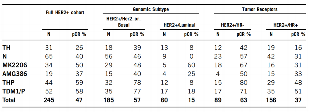 研究方法:该研究入组了HER2+肿瘤>2.5 cm的乳腺癌患者,对于HER2+乳腺癌EC-TH为该试验的标准对照组。用于HER2+乳腺癌的药物为TH(对照)、MK2206、AMG386、帕妥珠单抗(P)、奈拉替尼(N代替H)和T-DM1+P(代替TH)。基于基因表达的分子分型将肿瘤分为5种反应预测亚型(RPS):HER2-/Immune-/DRD(DNA修复缺陷)-、HER2-/Immune+、HER2-/Immune-/DRD+、HER2+/Her2_or_Basal和HER2+/Luminal。该试验研究结果表明对于完整的HER2+队列(N=245)中,所有研究组的pCR率均高于对照组(表1)。
