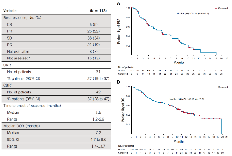 队列1纳入113例经顺铂和免疫治疗(CPI)进展mUC患者,既往治疗中位线数为3(范围1-8),对其予以SG单药治疗。中位随访9.1个月,主要研究终点ORR可达27%;次要研究终点中位无进展生存期(mPFS)5.4个月,mOS为10.9个月。安全性方面,常见≥3级治疗相关不良事件(TRAE)为中性粒细胞减少症(35%)、白细胞减少症(18%)、贫血(14%)、腹泻(10%)和发热性中性粒细胞减少症(10%),停药率为6%,安全可控[7]。队列1的研究全文得以在《临床肿瘤学杂志》(JCO)在线发表,并使SG获得FDA的加速批准。