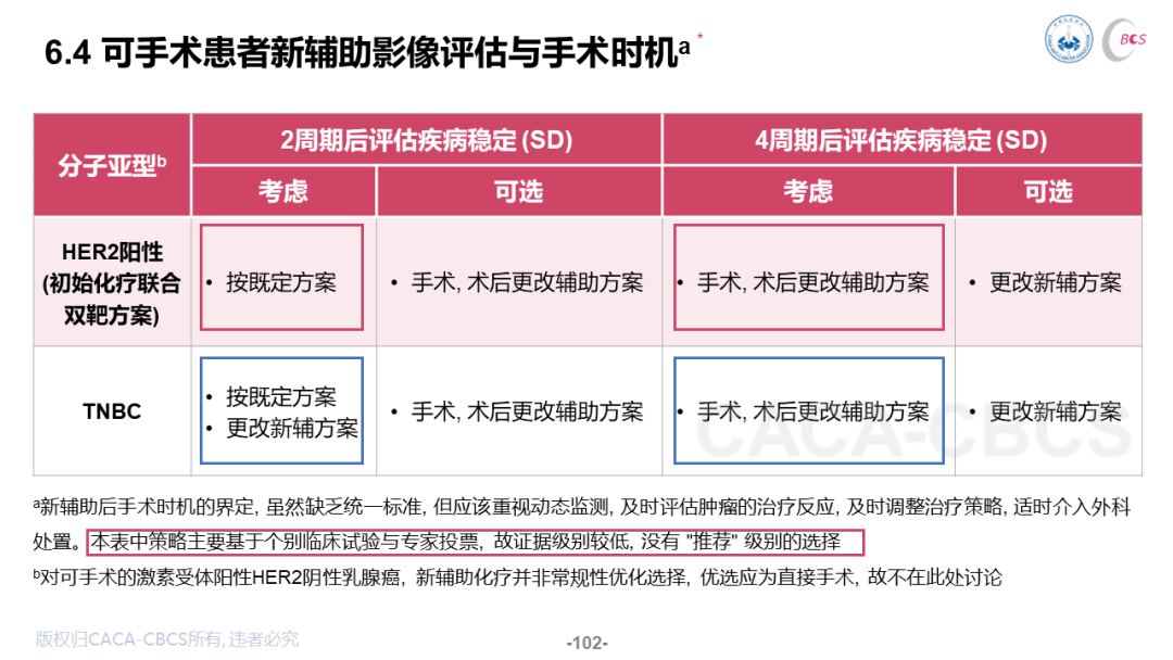 在NAC治疗期间,定期的疗效评估和监测也特别重要,指南中也明确告诉我们,新辅助的疗效评估主要依靠影像学来进行,评估结果分为CR、PR、PD、SD等等,只有通过这样的判断才能评估当前的治疗方案对于患者是否合适,如果出现SD的结果,指南上也有相应的后续方案推荐和指导,例如HER2阳性乳腺癌,如果2周期评估疗效不佳,可以继续使用原方案,持续观察,如果4周期评估依旧SD,就需要进行手术,并在手术后更改辅助阶段的方案或者直接更换一个新辅助治疗的方案;针对TNBC也同样是类似推荐。