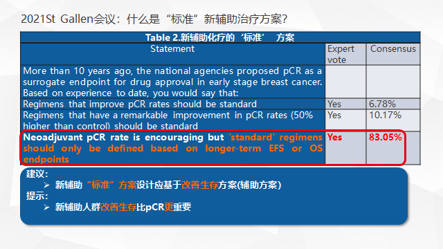 正因为如此,新辅助化疗方案的设计既要斩草,更要除根。所以,2021年St Gallen专家共识在讨论什么是“标准”新辅助化疗的问题上,80%以上的专家认为有“改善生存”证据的方案才是“标准”新辅助化疗方案(见图5)。大家再按照这个逻辑往上推,什么方案具有充分“改善生存”证据?不言而喻,是辅助化疗方案!因为只有辅助方案的研究,其主要研究终点指标才是生存指标(当然包括新辅助中的既包括pCR又包括生存指标的“双终点”研究)。