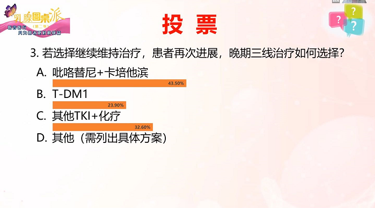 网上医生投票结果揭晓:这三个选择在意料之中,43.5%的网上医生选择了吡咯替尼+卡培他滨,32.6%选择TKI+化疗,23.9%选择T-DM1。