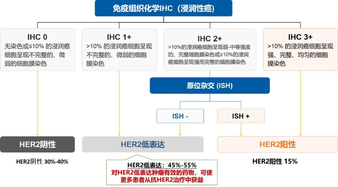依据《乳腺癌HER2检测指南(2019版)》,通过IHC与ISH相结合来检测HER2状态,结果IHC 3+的判断为HER2阳性,为IHC 0和1+的则判断为HER2阴性。如果为IHC 2+,则需进一步应用ISH进行HER2基因扩增状态检测,ISH阳性则为HER2阳性,否则为HER2阴性[15]。然而,随着新型抗HER2治疗药物的问世,相关研究结果显示,既往HER2 IHC 1+或IHC 2+且ISH检测阴性的人群也能够从新型ADC治疗中获益,提示需要对这部分人群予以重视,并以新的命名方式“HER2低表达”与HER2阳性和HER2阴性的判读结果加以区隔。