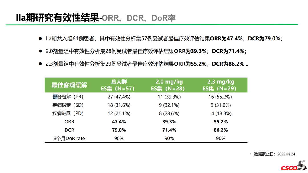 在MRG003-005研究的Ⅱa期疗效探索阶段,截止2022年6月8日,共入组了61例中国患者,其中MRG003 2.0mg/kg组30例,2.3mg/kg组31例,EGOG 0-1分,既往系统中位治疗线数为2线,均接受过含铂+PD-1方案,约90%的患者接受过放疗。研究结果显示:在有效性分析集的57例受试者中,总体ORR为47.4%,DCR为79.0%,3个月DoR率为90%;其中2.0mg/kg剂量组28例,ORR为39.3%,DCR为71.4%,2.3g/kg剂量组29例,ORR为55.2%,DCR为86.2%;2.0mg/kg剂量组mPFS为6.3个月,3个月PFS率为62.3%;2.3mg/kg剂量组mPFS未成熟,3个月PFS率为88.7%。亚组分析显示,96.5%的受试者EGFR表达量为1+及以上,无论肿瘤组织EGFR表达量高低,MRG003均取得了良好的疗效。