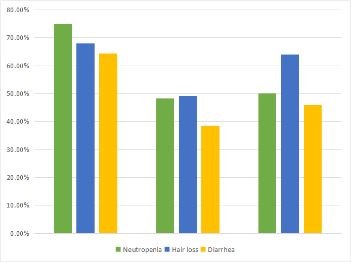 白细胞减少和中性粒细胞减少是最常见的不良事件,发生率分别为82.1%和75.0%,同时也属于3级及以上不良事件中最常见事件,发生率分别为46.4%、35.7%。