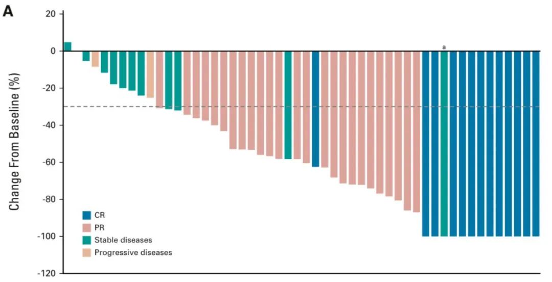 中位随访12.4个月,在52例可评估患者中,确认的总缓解率为65.5%(38例),其中13例达到完全缓解(CR率,22.4%),25例达到部分缓解(PR率,43.1%)[1]