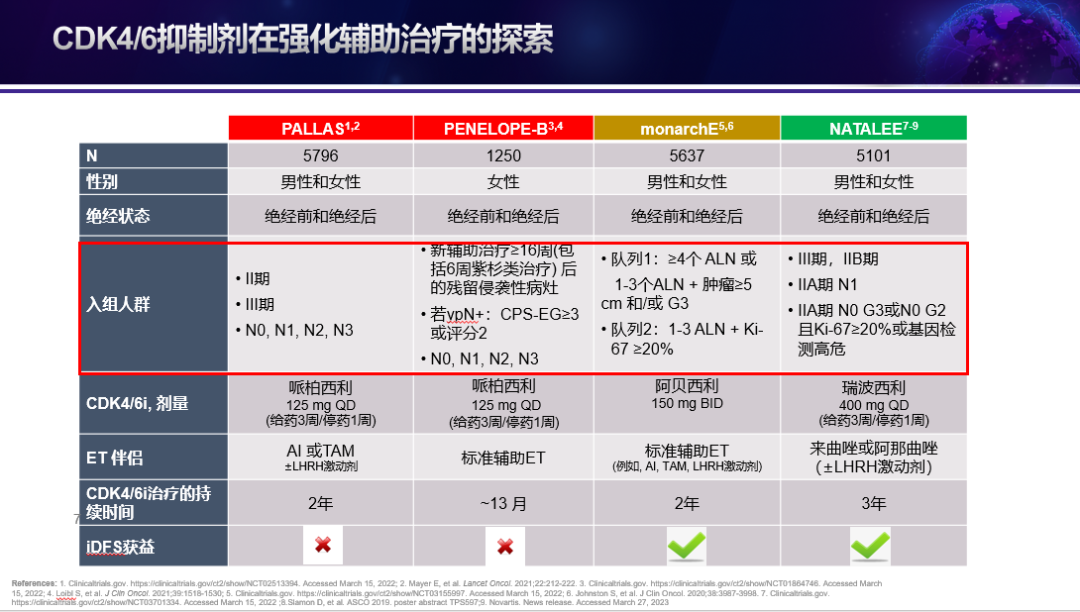 monarchE和PALLAS研究用的是2年CDK4/6抑制剂联合标准的内分泌治疗,NATALEE研究采用的是瑞波西利3年辅助治疗的方案。早期辅助CDK4/6抑制剂的用药时长尚无定论,期待后续有更多的研究进行相关的探索。