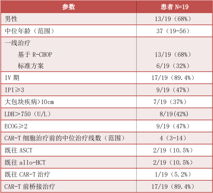 方法:这项单中心回顾性研究分析了2018年12月至2023年2月期间在北京高博博仁医院接受CAR-T治疗的伯基特淋巴瘤患者。纳入标准为成人复发和难治性伯基特淋巴瘤。共纳入19例患者。