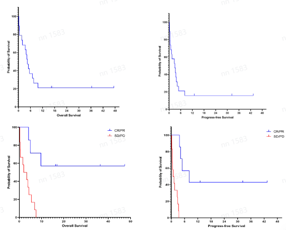 结果:CAR-T细胞输注的中位剂量为1.46*106/kg。CAR-T细胞中位扩增峰值为89.5(3.84-710)*106/L,发生在CAR-T细胞治疗后的第7天。3个月时的客观缓解率(ORR)和完全缓解率(CRR)分别为31.6%和21.1%。在CAR-T治疗3个月内达到完全缓解(CR)和部分缓解(PR)的患者,其生存曲线明显优于疾病稳定(SD)和疾病进展(PD)患者。PFS的单变量分析表明,危险因素包括白细胞分离时乳酸脱氢酶(LDH)升高(P=0.0182,HR=1.001)、3个月时SD/PD(P=0.0045,HR=20.8)和初始治疗为基于R-CHOP的化疗(P=0.0319,HR=0.183)。在这19例患者中,有12例患者继续接受其他巩固或挽救治疗,包括5例其他靶点CAR-T治疗、5例自体移植和2例异基因移植。然而,这些患者中只有4例保持无病状态。其中,2例患者接受异基因移植,1例患者接受自体移植,1例患者后续尚未接受其他治疗。